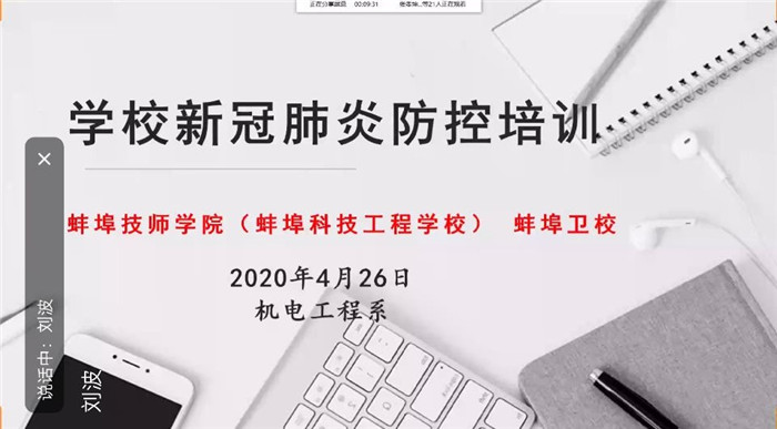 根据蚌埠市人社局和教育局相关文件要求,我院自4月26日起分批次组织师生返校复课。为进一步做好新冠肺炎疫情防控工作,保证师生返校复课工作的顺利进行, 4月26日下午2:30,我校机电工程系在实训北楼206室召开“教师返校复课疫情防控培训会”,会议形式为在线直播,系主任焦其彬主持会议,电工电子教研组组长刘波担任培训主讲,全体机电工程系教师参加了会议。