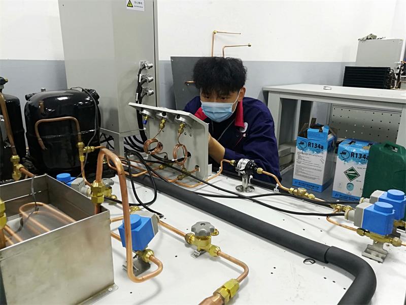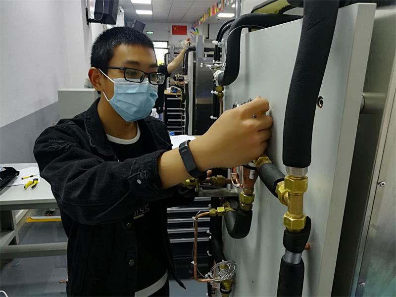 训练前,指导专家认真研究往届世界技能大赛的技术文件,并结合当前的技术发展,针对性的制定详细训练计划。训练中,每位选手都需要根据提供的元器件,完成制冷系统管路设计与制作、设备组装、系统保压、抽真空、充注制冷剂及调试工况等竞赛考核内容。