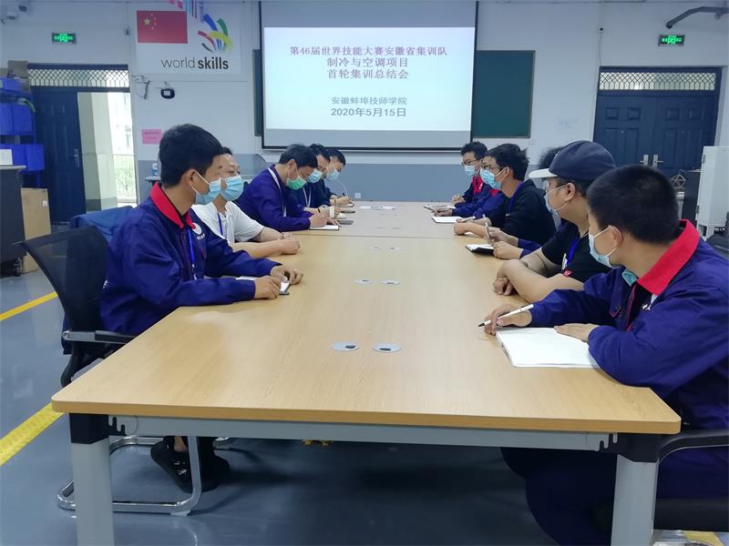 2020年5月15日下午,第46届世界技能大赛制冷与空调项目安徽省集训队首轮集训总结会在安徽蚌埠技师学院召开。会议由安徽蚌埠技师学院机电工程系骨干教师、制冷与空调项目专家组组长贾长林主持,安徽蚌埠技师学院机电工程系主任焦其彬、电工电子教研组组长刘波、安徽金寨技师学院教研室主任专家组成员李晓伟、安徽芜湖技师学院骨干教师专家组成员杜凡亭、淮南职教中心骨干教师陈朝山以及参训选手等参加会议。
