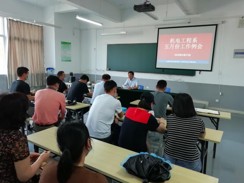 5月27日下午,机电工程系在学院汽车实训基地南110室召开五月份工作例会,总结2019年系部工作,部署当前阶段工作。会议由系主任焦其彬主持,全系教师参加会议。