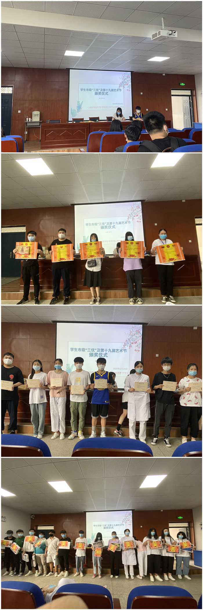2020年5月20日星期三,校团委携学生会主要成员与获奖者一道,在北教学楼101阶梯教室举行了学生市级“三优”及第十九届艺术节颁奖仪式,见证职教学生的发展与进步。