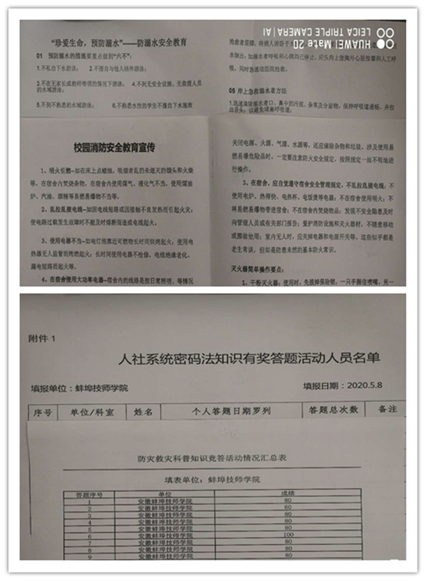学院保卫处通过学院网站,关注微信公众号,安全知识竞赛,防灾救灾科普知识答题,发放安全知识教育宣传材料等多种形式宣传安全相关法律知识,安全防范措施,增强了广大师生安全意识,营造安全教育宣传的良好氛围。