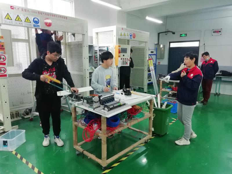本次实操教学活动安排在实训北楼西201室(即省级赛点电气安装与维修实训室)进行,由电气安装与维修项目指导教师康利亚、chen陈云颖两位老师负责现场授课和实操指导。教学内容参照技能大赛集训内容,要求学生在规定的时间内,按照任务书的要求,完成电气原理图的绘制、控制盘的安装接线、故障检测排除等工作任务。