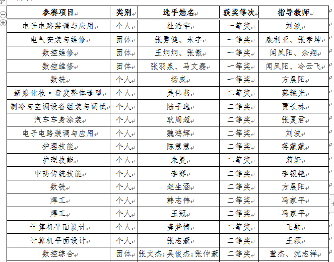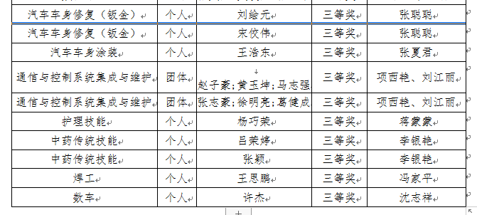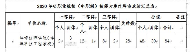 近日,2020年安徽省职业院校技能大赛中职组竞赛结果正式公示,我校延续以前年度的辉煌,在大赛中取得骄人战绩,硕果累累。在参加的7个团体赛项、12个个人赛项的竞赛中共取得5个一等奖(团体奖3个、个人奖2个),13个二等奖(团体奖1个、个人奖12个),10个三等奖(团体奖2个、个人奖8个),总分84分。和2019年相比,再上一个台阶;和兄弟学校相比,继续站在蚌埠市中职学校的最前列,可喜可贺!