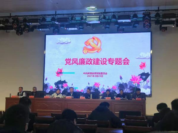 按照学院党委工作安排,一支部部分党员于2021年3月23日下午2:20,在学院信息楼二楼多功能报告厅参加了中共蚌埠技师学院委员会2021年度党风廉政建设工作会议。