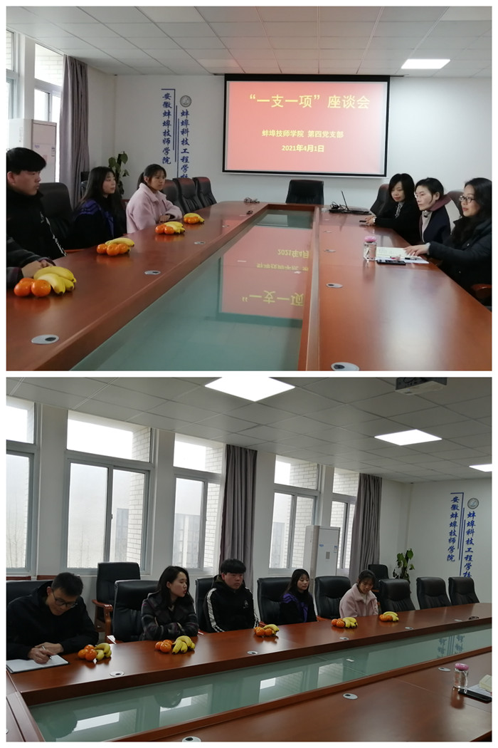 2021年4月1日上午9时,四支部在行政楼支部活动室召开“一支一项”帮扶困难学生座谈会。支部书记、支委、帮扶党员及困难学生代表参加了活动。