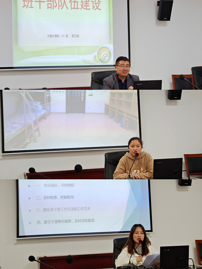 此次活动主要针对“怎样带出优秀的班干部团队”进行学习交流。班干部团队,既是班主任的智囊团,也是班集体的定心剂。打造一个好的班干部团队,不仅为班主任培养得力助手,更是学生能力提升和自我管理的重要途径。本次邀请了程乃润、李银艳和李姗姗三位优秀的班主任进行经验分享,他们根据自己多年的带班经验,结合所带班级的专业特色,分别从班干部的选拔、分工和培养等方面,详细讲述了