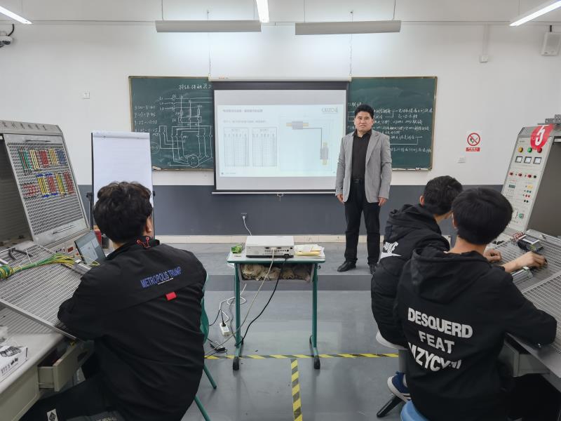 本次授课围绕“工业机械师电气基础培训”领域进行,授课现场选在学院机电工程系电力拖动实训室,机电工程系骨干教师康利亚、陈云颖配合教学。培训期间,我院领导及中德双元制工业机械师班教师先后观摩了李飞工程师的现场授课。