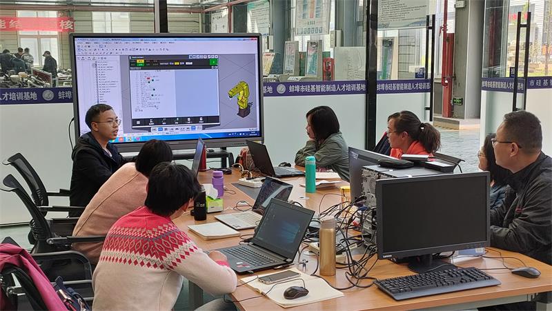 培训过程中,教师们一起学习新技术,探讨机器人的工作特点、程序编译方法、机械结构、仿真环境等,并现场动手实现了机器人车窗吸取任务工作。