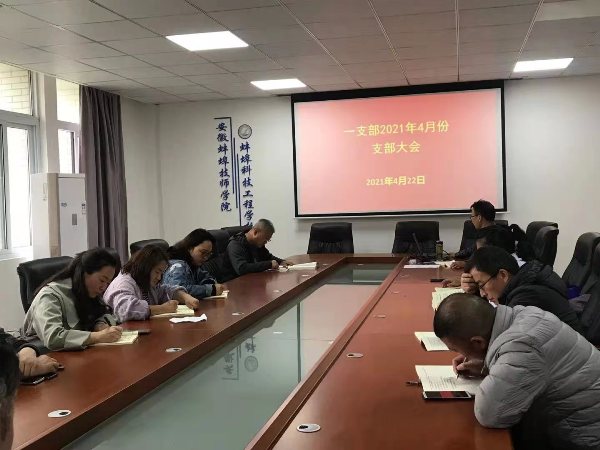 按照中共蚌埠技师学院第一党支部2021年第2季度党员学习教育安排,一支部于2021年4月22日下午在行政楼三楼一支部活动室召开了2021年4月支部大会。一支部书记王玮同志主持会议。