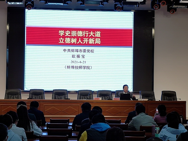 4月21日下午,我院举行党史学习教育专题辅导报告会,邀请中共蚌埠市委党校欧振宝教授进行授课。党委书记陈元高主持报告会并讲话,学院领导班子成员、全体党员和部分学生代表聆听了报告。