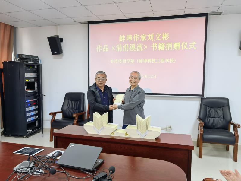 刘文彬,笔名流奔,安徽省蚌埠市作家协会会员,军队退休干部,刘老师多年来一直致力于文学作品创作,多篇作品在各类大型期刊、报纸、杂志等刊物发表,此次捐赠我院师生书籍《涓涓溪流》,近70套,旨在激励我院学生学好技能、丰富知识,更加的努力学习、奋发向上,将来做一个对国家和社会有用的人,同时号召全体师生将爱心接力棒传承下去,让雷锋精神的种子遍地开花。