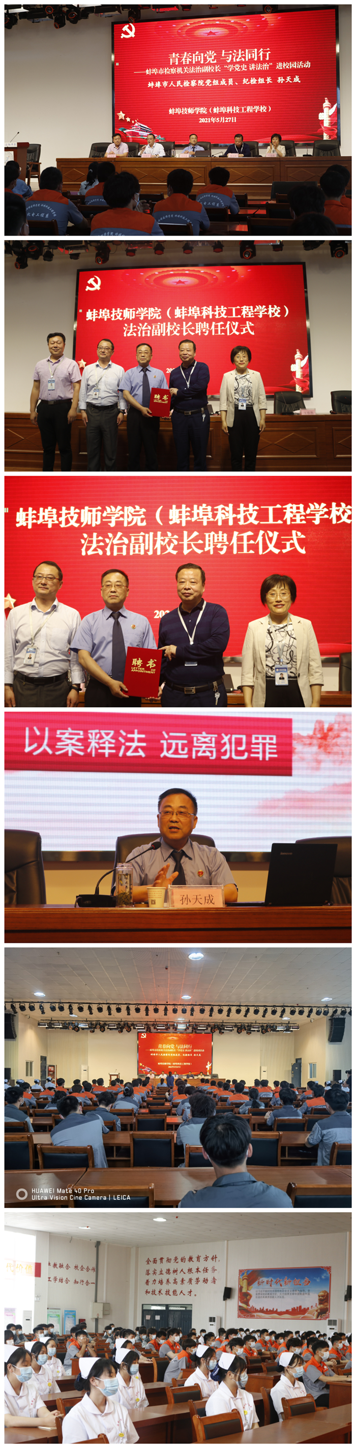 5月27日下午,我院邀请了法治副校长孙天成同志(蚌埠市人民检察院党组成员、纪检组长),来校为师生开展“学党史 与法同行”法治进校园宣讲活动,学院陈元高书记、宋晓宾院长、王春燕副书记、陈华坤副院长等领导与会陪同。