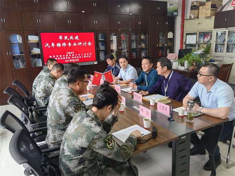 为积极响应蚌埠市双拥模范城市创建,落实我院双拥创建工作,5月18日下午,安徽蚌埠技师学院(蚌埠科技工程学校)与陆军军事交通学院汽车士官学校“军民共建汽车维修专业研讨会”在学院3号楼206室隆重举行。