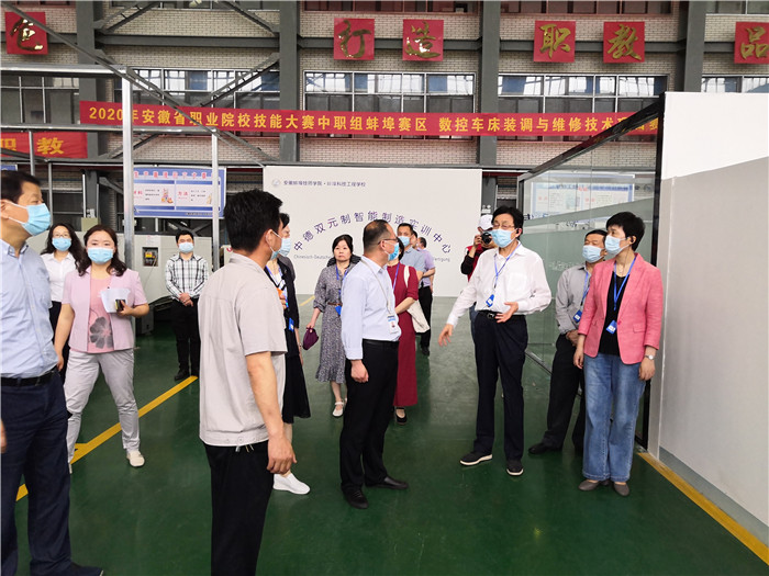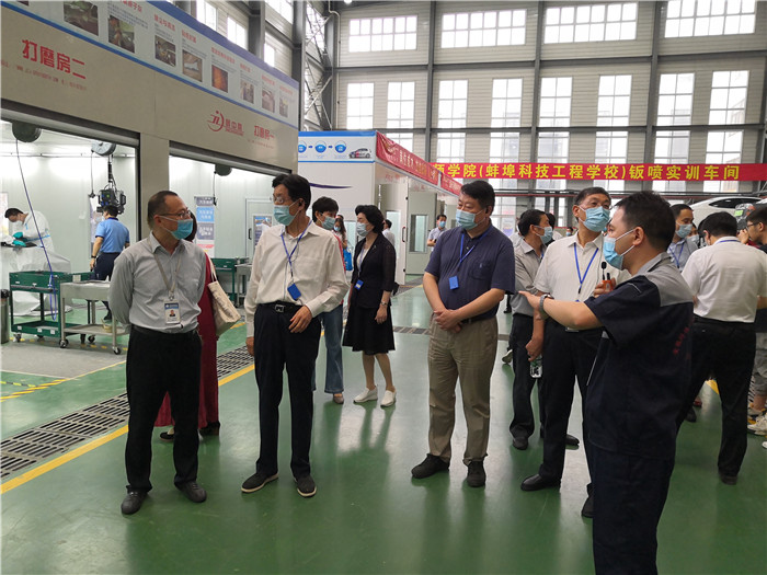 在蚌埠技师学院宋晓宾院长引导下,调研组一行走进学院公共实训中心。上午,学院在这里承办的全市2021年中职院校校园招聘活动刚刚结束,谢广祥对学院服务地方经济社会发展的实事表示肯定。调研组一行先后走进数控、金工、汽车整车、钣喷实训车间考察调研。各车间实训条件一流,众多学生在教师指导下操作实习,宋晓宾向谢广祥详细介绍了学院围绕蚌埠市硅基、生物基等优势产业进行专业建设和技术技能人才培养情况、学生就业情况。谢广祥对学院鲜明的现代职教特色表示肯定,对学院的办学模式提出了指导意见。