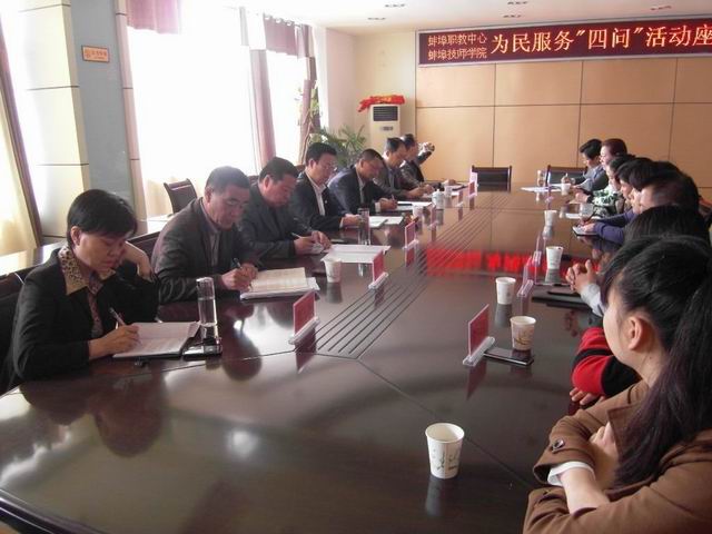 为贯彻市委教育实践活动领导小组《关于在全市党的群众路线教育实践活动中深入开展党员干部为民服务“四问”活动的实施意见》(蚌群组发〔2014〕16号),蚌埠职教中心蚌埠技师学院于2014年4月29日召开了学校党员干部为民服务“四问”活动座谈会。