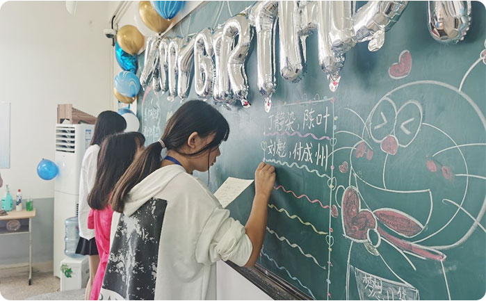 这次庆生会的主角是7、8、9三个月的生日寿星们。中午11点多,各个班就在班主任的带领下开始布置教室,造型各异的生日气球、创意迭出的黑板报,都满载着全班同学真挚的祝福。