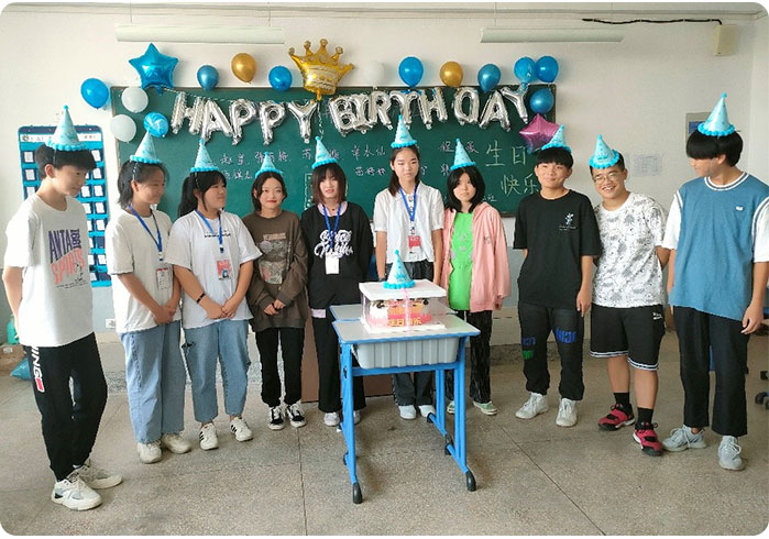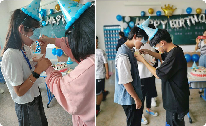 各位班主任为寿星们戴上生日帽、送上生日祝福贺卡,并邀请他们做简单的自我介绍,帮助同学们相互熟悉。