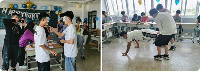 互动游戏环节,五个班各显神通,击鼓传气球、蒙眼喂蛋糕、金曲大联欢……精彩纷呈的游戏洋溢着青春的欢乐,也让同学们在忙碌的学习之余过个轻松愉快的节日。