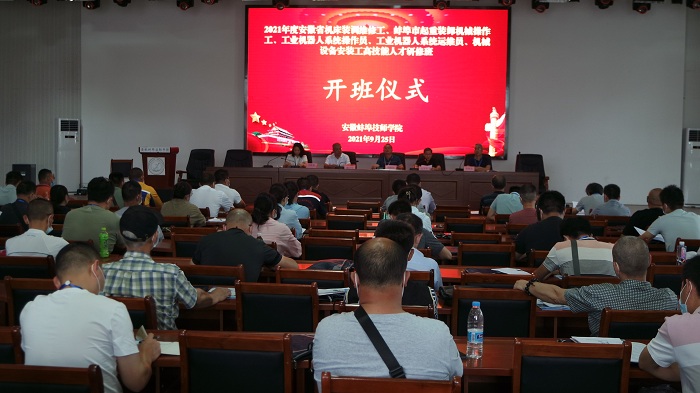 9月25日上午,2021年度安徽省机床装调维修工、蚌埠市起重装卸机械操作工、工业机器人系统操作员、工业机器人系统运维员、机械设备安装工高技能人才研修班开班仪式在蚌埠技师学院多功能报告厅举行。学院领导宋晓宾院长、姚卫宁副院长、纪委书记包太平出席开班仪式。开班仪式由学院教务处处长史毓勇主持。