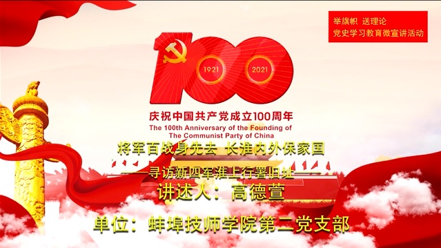 为庆祝中国共产党成立100周年,弘扬红色文化,传承红色基因,强化初心使命,汲取奋进力量,市直机关工委组织举办了全市第三届“举旗帜 送理论”暨学百年党史、悟初心使命微宣讲竞赛,二支部高德萱老师的作品——《将军百战身先去·长淮内外保家国》在初赛中脱颖而出,代表蚌埠技师学院参加全市竞赛。