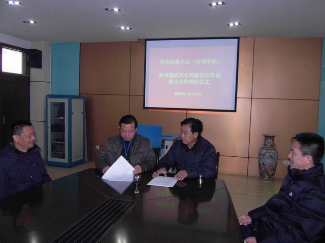 2012年12月14日上午,我校与蚌埠城南汽车驾驶培训学校联合办学签字仪式在我校会议室举行,双方法人代表陈元高、汤建文等出席签字仪式。
