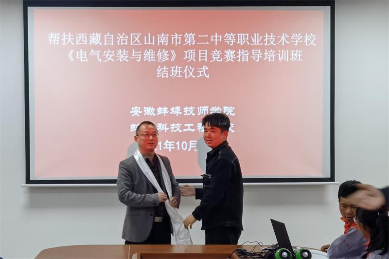 10月26日下午,经过一周的强化训练,蚌埠技师学院帮扶西藏自治区山南市第二中等职业技术学校(以下简称山南二职校)《电气安装与维修》项目竞赛指导培训班圆满结束。山南二职校师生们带着学习的诚意和内心的感动来到我院,我院领导和指导教师们则在生活上满怀热诚的关心帮助他们,在技能训练上无私的指导培训他们,真正实现了藏汉一家亲的使命。