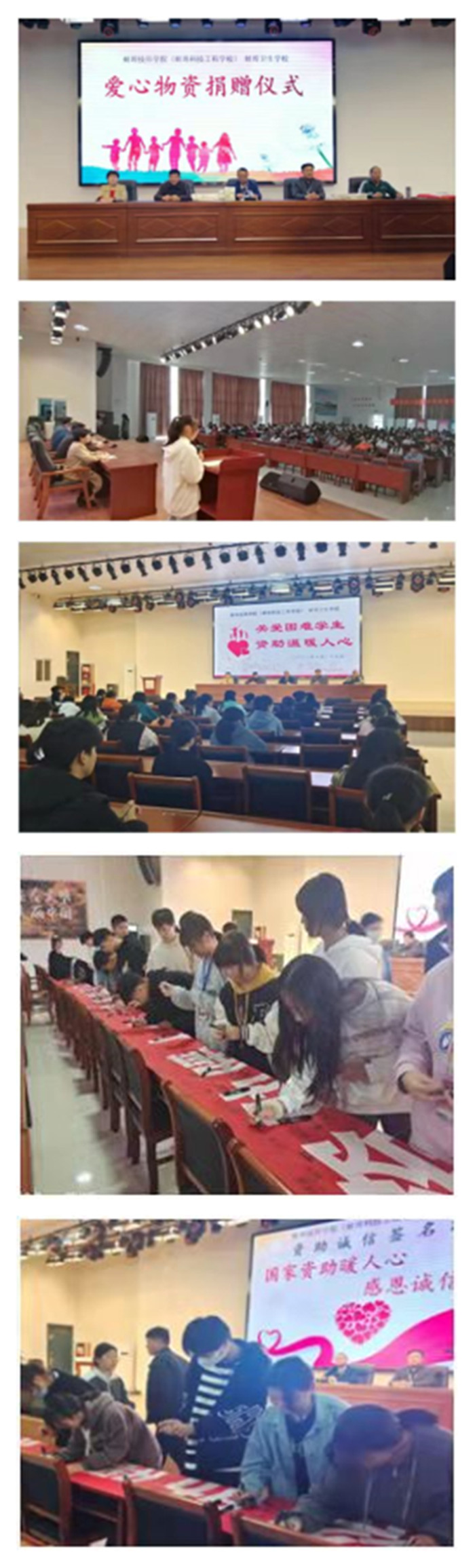 学生资助是一项重要的保民生、暖民心工程,事关教育公平,事关社会公平。为了深入贯彻党的精神,为困难学生和家庭办好事,办实事,强化资助工作育人成效。10月29日上午,我院学生处在多功能报告厅开展“关爱困难学生 ,资助温暖人心”为主题的,爱心物资捐赠及资助诚信签名活动,近200名受国家助学资助的学生代表参加活动。宋晓宾院长、卢嘉砾副院长、陈华坤副院长参加会议,此次会议由学生处郭仁龙处长主持。