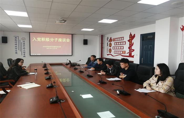 11月5日下午 ,蚌埠技师学院第四党支部在行政楼406四支部活动室召开入党积极分子座谈会,四支部书记张静同志与各位入党积极分子从各方面进行了深入细致的交流。