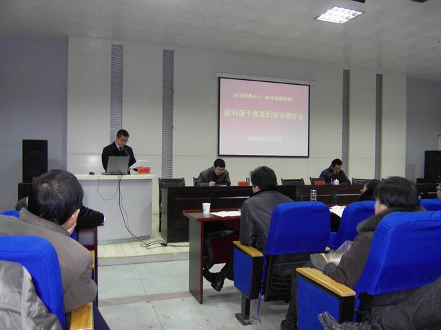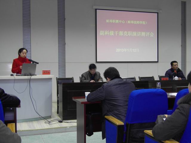 2013年1月12日下午1:30,我校副科级干部竞职演讲测评会在多功能报告厅举行,校教代会代表、校领导、主管部门部分领导等79位评委参加了测评会。校党委书记胡业武主持会议。