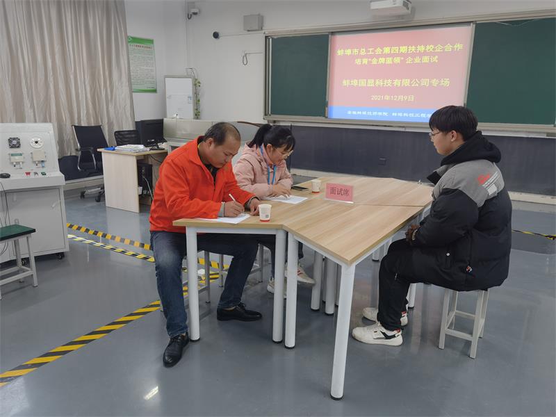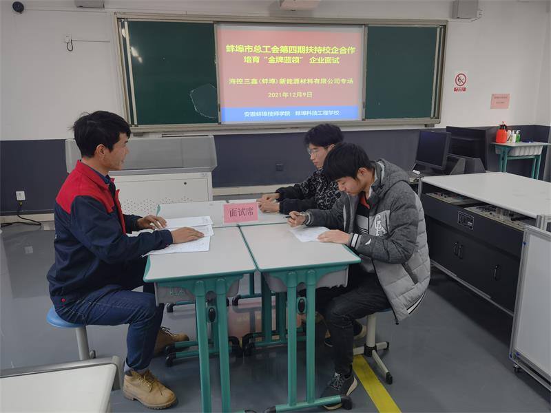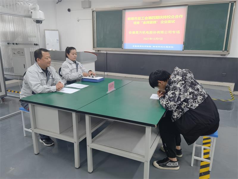 12月9日下午,安徽蚌埠技师学院(蚌埠科技工程学校)举办了蚌埠市总工会第四期扶持校企合作培育“金牌蓝领” 企业面试专场会。第四期金牌蓝领人才培养合作企业安徽昊方机电股份有限公司、蚌埠国显科技有限公司、海控三鑫(蚌埠)新能源材料有限公司人力资源相关负责人分别与我院机电工程系、机械工程系部分专业学生进行了专场面试,共有26名学生参加了面试。