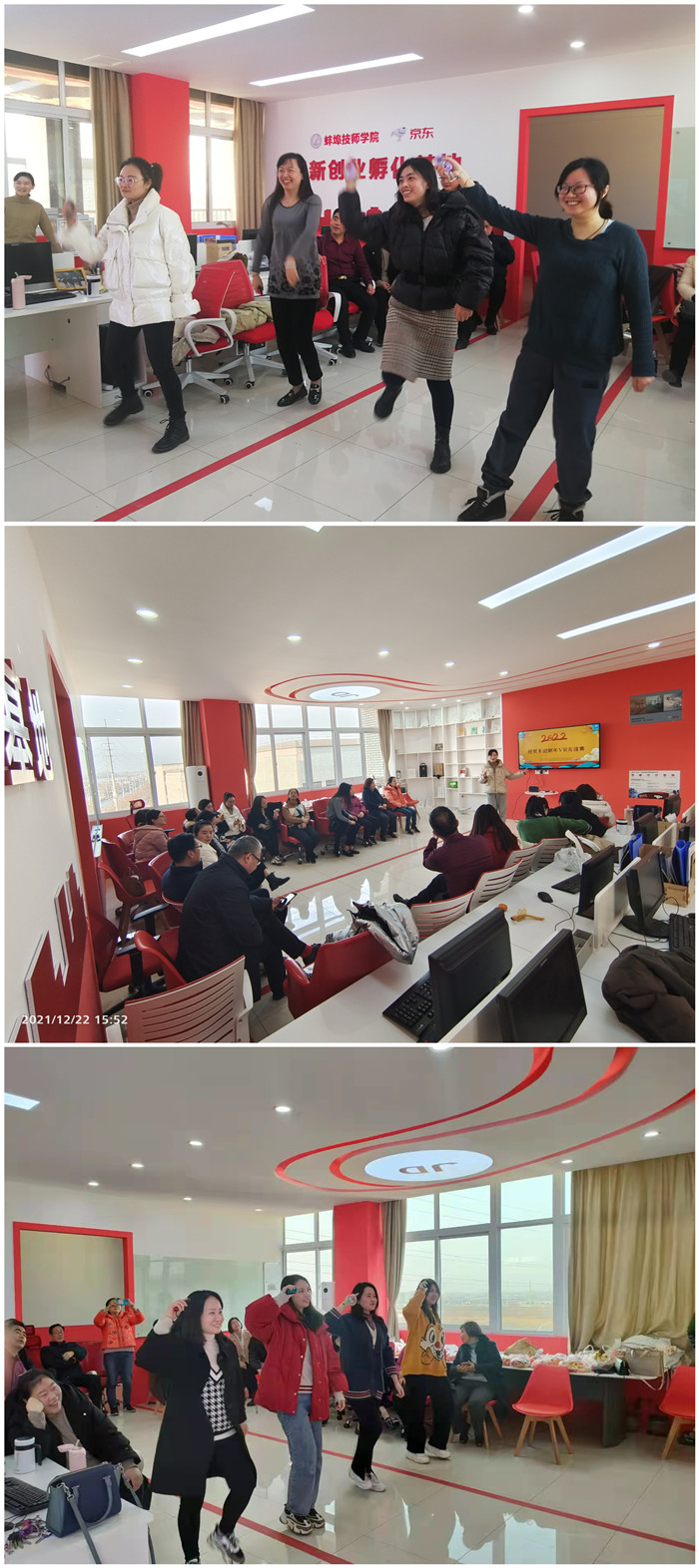 活动方案出台后,广大教职工踊跃报名,积极为参赛做准备。12月22日下午,参加比赛的教职员工汇聚经贸系电商实验实训室。简短的介绍后,同志们做了热身活动,随后迎新switch跳舞比赛开始。