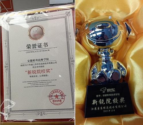 众行致远——2021京东第七届校长班颁奖盛典”,蚌埠技师学院在京东几百所合作院校中脱颖而出,荣获京东校企合作年度“新锐院校奖”。