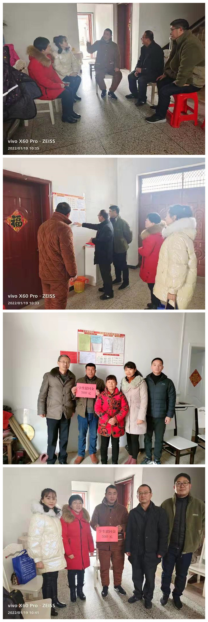 为进一步落实国家相关文件精神,推进我校资助育人工作,助力学生成长成才,不断激发学生爱党爱国热情,知党恩,颂党情,永远跟党走。2022年1月19日宋晓宾院长带领学生处领导、资助中心老师,前往固镇县走访慰问原建档立卡家庭经济困难学生,并带去慰问金。