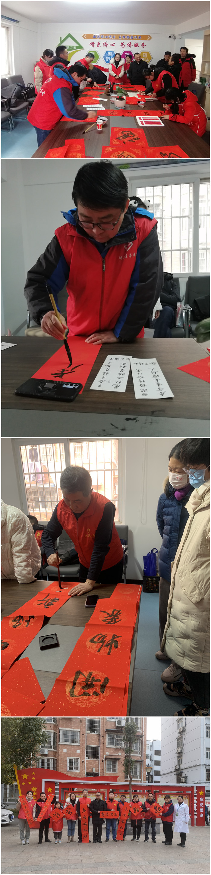 虎年新春佳节将至,2022年1月29日下午,蚌埠技师学院第四党支部联合蚌山区黄庄街道红旗社区举办“喜迎新春写春联,情满社区送祝福”传统节日活动,四支部书记张静同志携支部3名党员及支委同志,在红旗社区二楼会议室挥毫泼墨、笔走龙蛇,为社区居民书写春联、送福字,将满满的祝福传达给社区的家家户户。