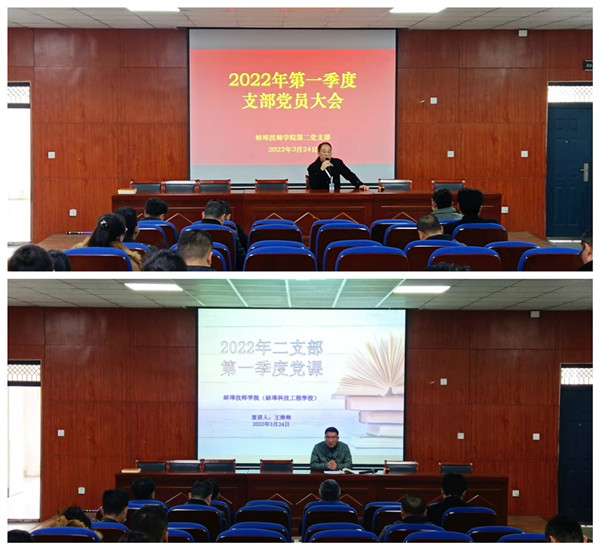 3月24日,蚌埠技师学院第二党支部召开一季度支部党员大会暨一季度党课,学习传达了习近平总书记在中央党校(国家行政学院)中青年干部培训班开班式上的重要讲话、习近平总书记的“五个必由之路”以及省委书记郑栅洁在蚌埠市调研重要讲话精神,研究落实调研讲话强调的重点工作。第二党支部书记孙志伟主持会议。