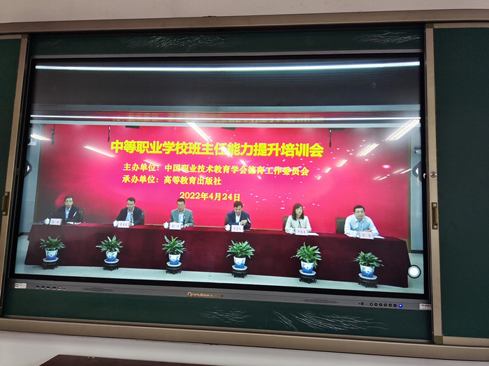 为落实立德树人根本任务,深入学习贯彻习近平总书记对职业教育工作的重要指示精神,推动班主任队伍专业化建设。4月24日早上9:30,我院分管领导陈华坤副院长、学生处领导和未授课的班主任在教学楼一楼阶梯教室,参加由教育部职成司安排、中国职业技术教育学会德育工作委员会主办、高等教育出版社承办的线上“中等职业学校班主任能力提升培训会”。