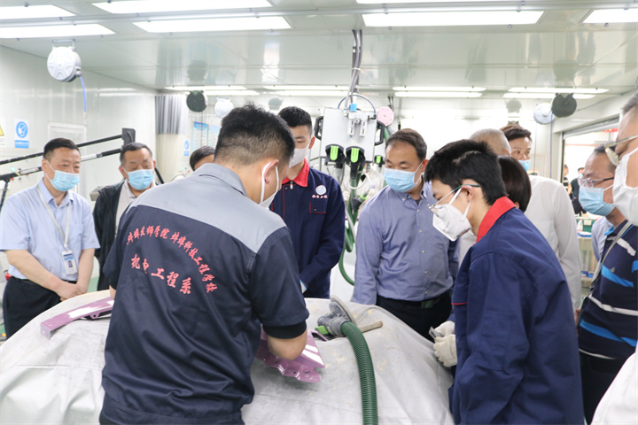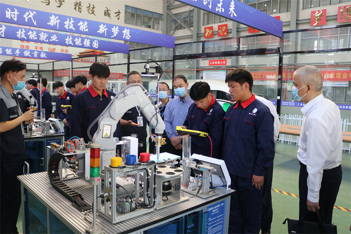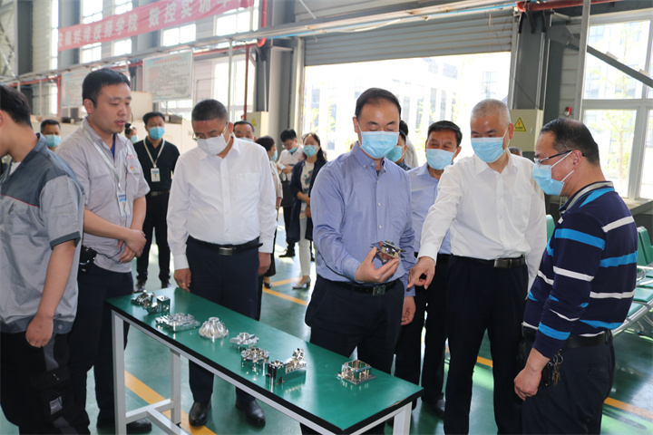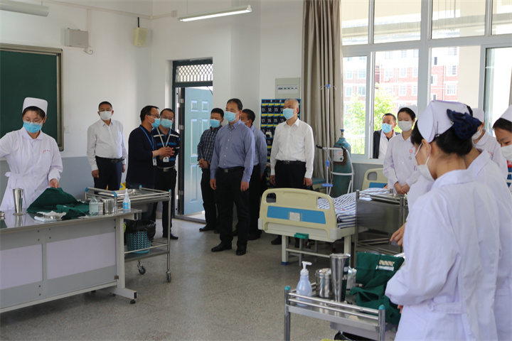 市领导一行在宋晓宾院长引导下,先后走进数控、金工、汽车整车、钣喷实训车间、医护系无菌实验室等考察调研。每到一处,吴永彬副市长认真听取了相关系部负责人对实训车间建设、技能人才培养及招生就业情况的介绍,观看了学生实训操作情况、实验课堂教学情况,了解技能大赛获奖情况。