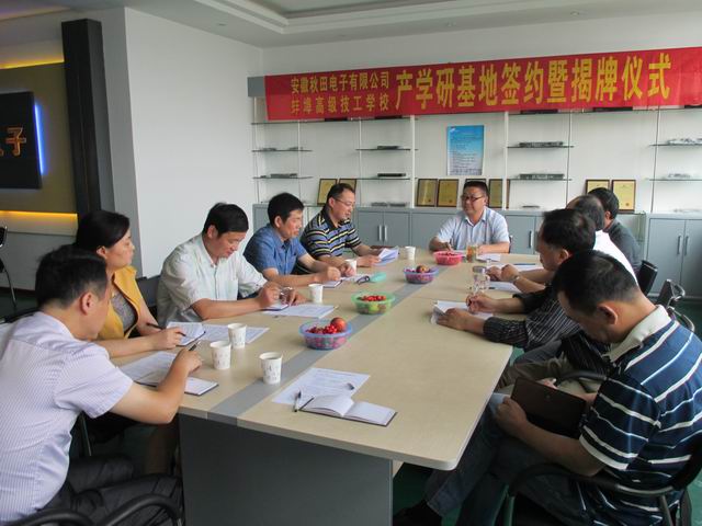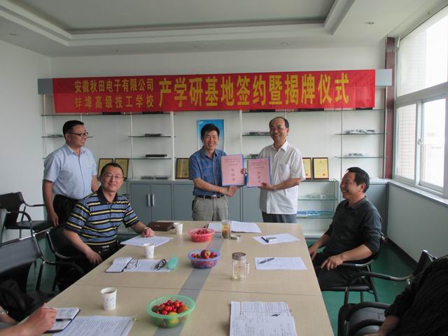 2014年6月4日,我校与安徽秋田电子有限公司共建产学研实习基地签约暨揭牌仪式在安徽秋田电子有限公司会议室隆重举行。我校副校长宋晓宾、机电工程系主任王秀军,副主任焦其彬、高龙,市学科带头人周少梅老师以及教研组长苏玉杰出席仪式。