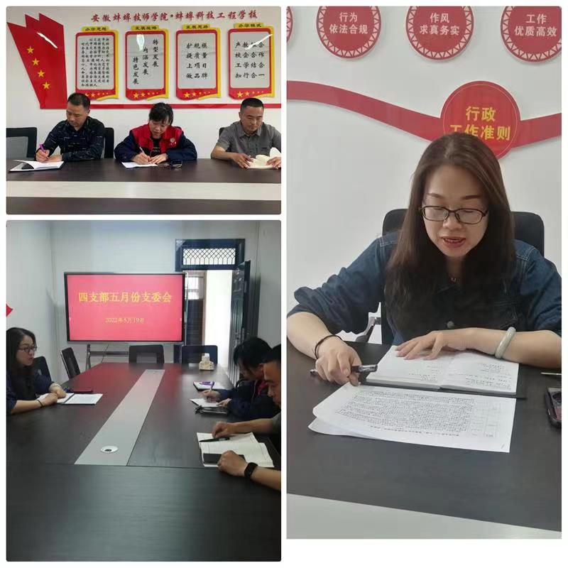 5月19日上午,蚌埠技师学院第四党支部在行政楼301会议室召开5月份支委会会议,四支部全体支委同志参加,会议由支部书记张静主持。
