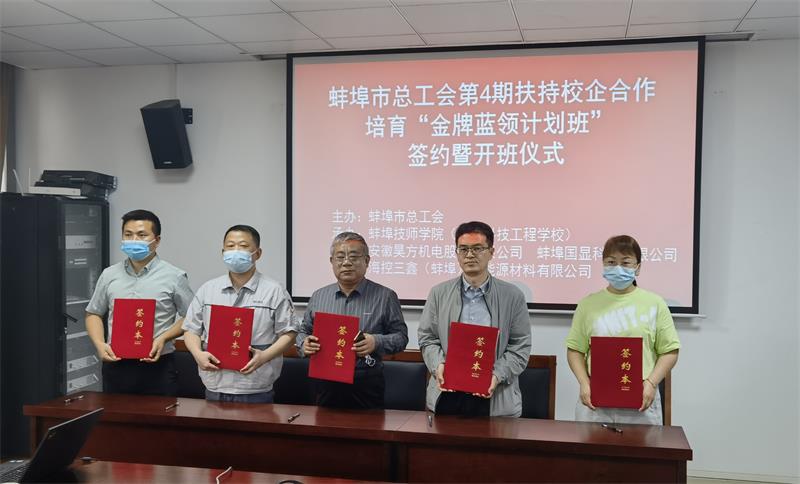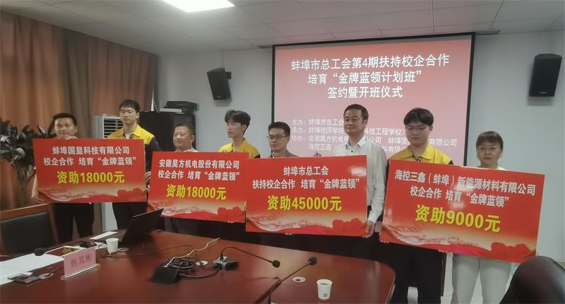 5月19日下午,蚌埠市总工会第四期扶持校企合作培育“金牌蓝领计划”班开班仪式在我校隆重举行,仪式由我校机电工程系主任焦其彬主持。蚌埠市总工会四级调研员李智光、权益保障部部长高玉正,蚌埠技师学院(蚌埠科技工程学校)副院长姚卫宁及相关领导,安徽昊方机电股份有限公司人事经理王新军,蚌埠国显科技有限公司招聘主管张文静,海控三鑫新能源材料有限公司行政人事部经理王旭等相关企业领导,机械工程系和机电工程系“金牌蓝领计划班”各班主任及15名学生参加了此次仪式。