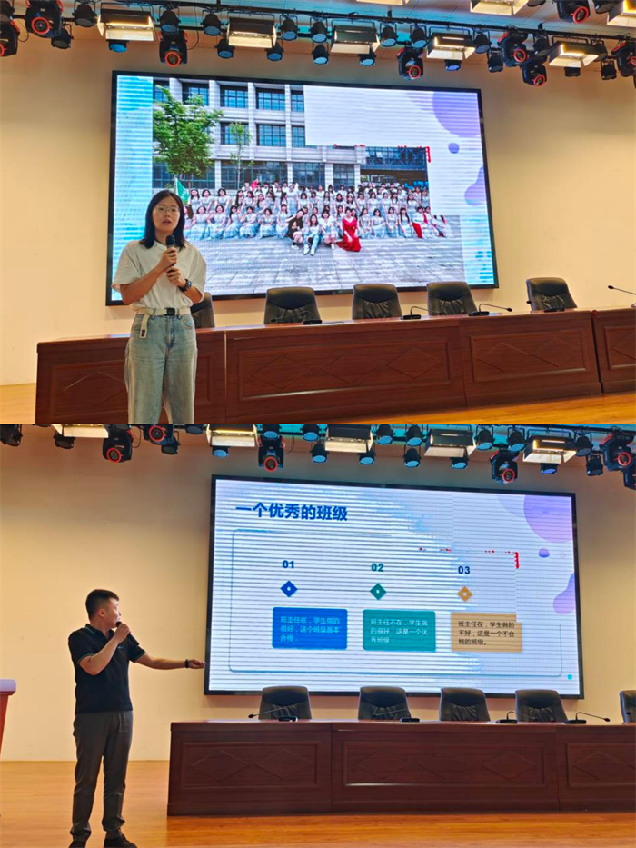 杨森、方晨阳两位老师进行班主任工作的智慧分享。杨老师分享了她是如何健全的班级制度,关爱关心学生以及与其他教育者的协调合作,要善于总结与借力。方老师分享的主题是《做今天,想明天》,第一次带班的他在本学期班级量化考核中取得了优异成绩,他用“责任心”、“细心”、“用心”三个词概括了他工作的特别之处。两位青年班主任用朴实的语言,诠释了班主任最无私的爱,他们付出的是一滴滴汗水,收获的是沉甸甸的情感和师生的共同成长。