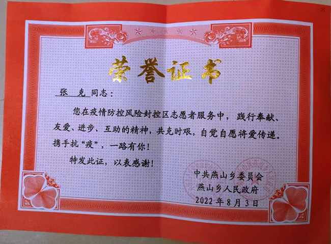 7月下旬,蚌山区突现确诊病例,蚌埠技师学院张克同志所在的小区被列为封控区域。他主动请缨、参加志愿服务,投入到社区防疫工作,承担了多项任务。每轮核酸检测,及时、准确将小区核酸检测点核酸检测试剂的转运到指定位置;承担了小区18号楼的生活保障工作,高温酷暑下,挨家挨户将蔬菜、药品、日用品等生活保障物资分发到居民家中;白天在小区内劝导擅自出门的居民;晚上协助社区做好核酸检测信息录入工作。他每天提前上岗,认真负责、勇挑重担,成为社区志愿服务的中坚力量,获得了蚌山区燕山乡的表彰。