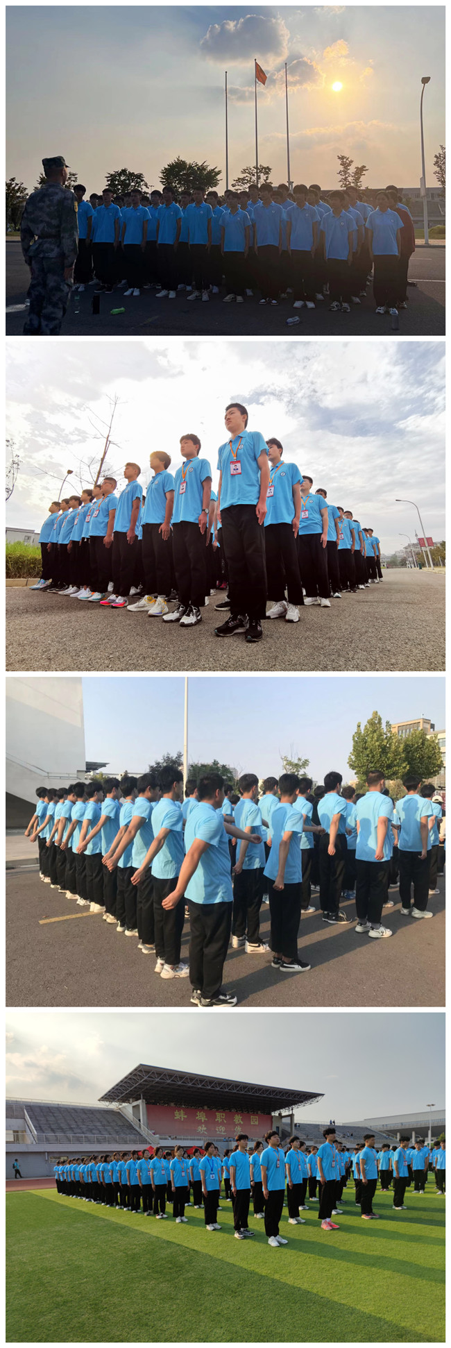 军训总是和睛天不期而遇,秋日艳阳,暖暖地照射在学生天蓝色的体恤上,和碧蓝如洗的天空浑成一体,映衬着同学们一张张朝气蓬勃的脸庞。挺胸收腹,立正站直,目光上仰,双手紧贴裤缝,军姿,是军训的第一关,站军姿是对意志力最好的训练。笔挺的军姿,坚毅的目光,展示着技师学子的风采。稍息、立正、向左转、向右转,响亮的口号,坚定的步伐,大家迎着朝阳,斗志昂扬。“一二一、一二一、”他们脚迈大步,汗流浃背,每一个动作,都闪烁着青青的光芒。