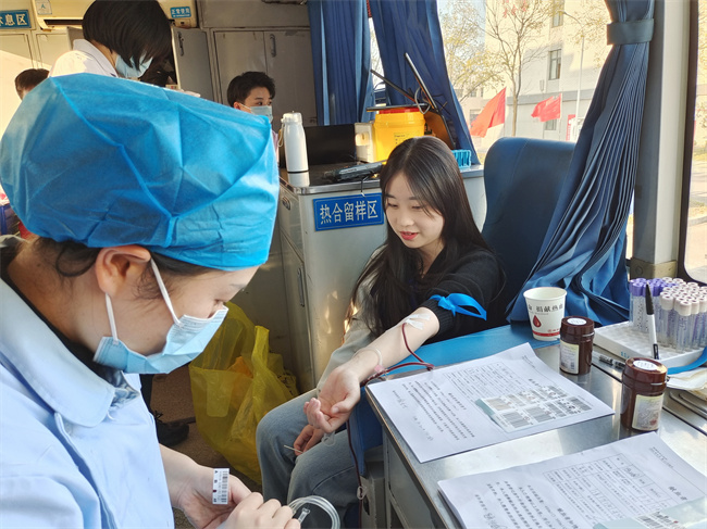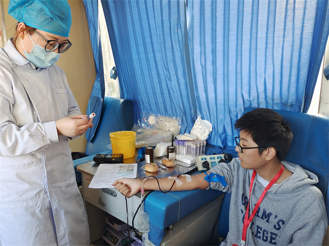 来自2021级西点1班的王博激动地说道:“这是我第一次献血,其实上学期我就有献血的意愿了,因为年龄没到错过了机会。得知今天献血车来校,我特别开心,希望我献出的这一份爱心,能将温暖传递给更多的人。”令人感动的是还有几位娇小的20级幼儿教育专业的女生也积极参加到了无偿献血队伍。