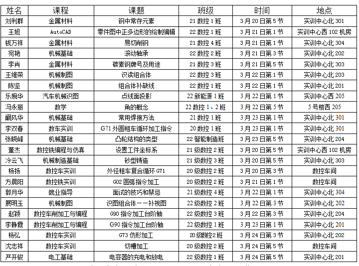 1、周实训班级:汽车涂装实训(21汽修2班);变速器拆装实训(22汽修2班);电子成品焊接实训(22机电3班)。