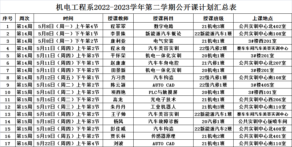 1、周实训班级:21汽修3班(整车维护实训);22汽修2班(汽车电子焊接实训);22新能源汽车1班(汽车美容实训);21机电1班(电气安装与维修实训)。