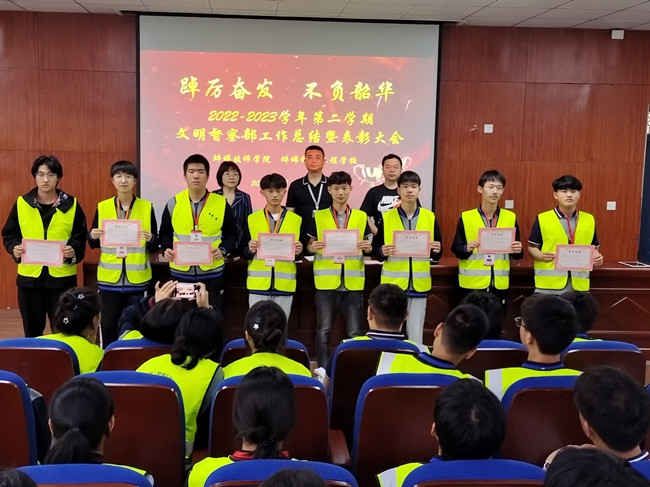 会上对本学期工作突出的同学进行了表彰。在过去一学期中,文明督察员在德育常规管理、班级量化考核、特色活动等方面均获得了显著的提高。这份成绩离不开每一位文明督察员的辛苦付出,更离不开学院领导和老师的关心帮助以及全体同学的大力支持。