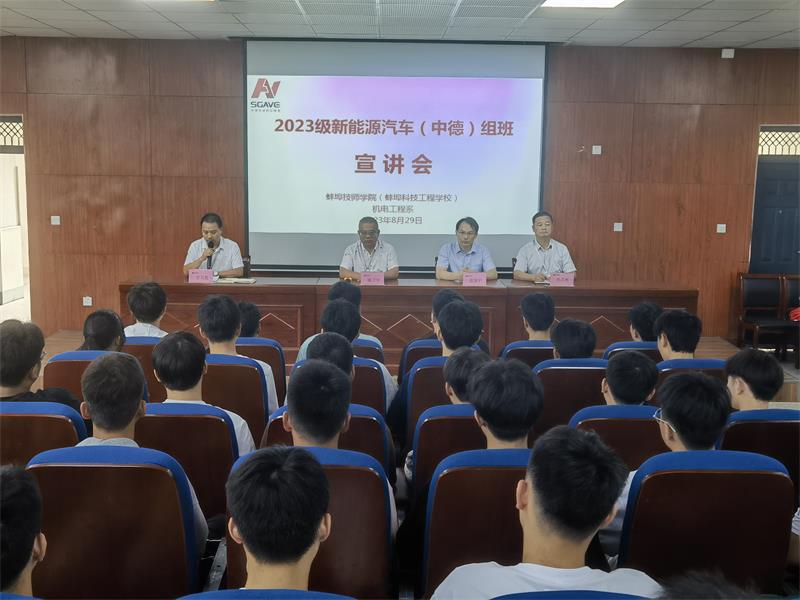 8月29日上午, 2023级“中德先进职业教育新能源汽车班”组班宣讲会暨选拔考试在我校隆重举行。姚卫宁副院长、机电工程系负责人、中德新能源汽车班班主任及报名参加选拔的学生参加了组班宣讲会。教育部中德先进职业教育合作项目培训讲师范国平到现场宣讲。