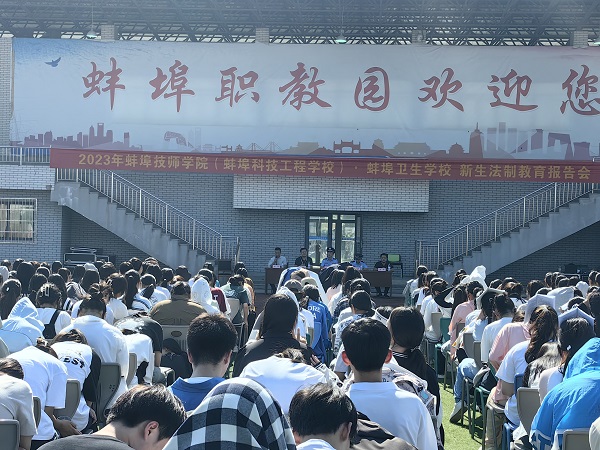 为增强学生的安全意识,提高学生的法律观念,营造文明、平安、和谐的校园育人环境,2023年8月31日下午,我院邀请了双墩派出所所长梅厚斌和王鹏警官为学校新生举行了一场精彩的法治报告会。副院长陈华坤、学生处,保卫处负责人出席了报告会。